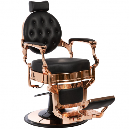 Fin barberarstol MAE COPPER med elegant design och klädsel i svart konstläder av hög kvalitet som är lätt att rengöra. Metallramen, den runda basen och den låsbara hydraulpumpen ger frisörstolen den nödvändiga funktionaliteten och stabiliteten. Sitsen är gjord av skum med hög densitet för bästa komfort vilket kommer förvandla besöket i hårsalongen till en uppskattad upplevelse.