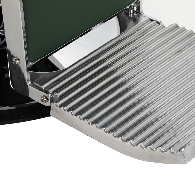 Fin barberarstol VISIONERIO är både mycket bekväm och elegant. Kundstolen är stabil tack vare sin robusta stomme och har justerbart huvudstöd, fotstöd samt ett fällbart ryggstöd. Klädseln är tillverkad av antibakteriellt konstläder i en grön nyans som är lätt att rengöra.