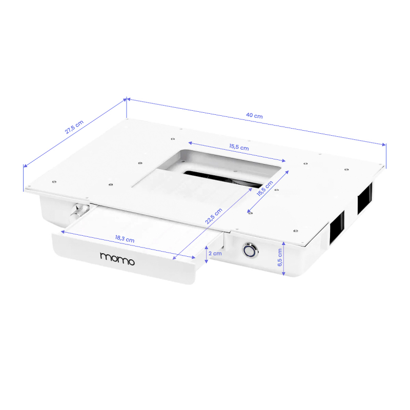 Inbyggd i bänkskivan högeffektiv dammutsug, utrustad med fyra utsugsturbiner samt effektiv kassettfilter som är mycket tyst trots sin höga uppsugningsförmåga. Bordsutsug är ett underbar hjälpmedel för dig som bygger med naglar och inte vill ha damm från när du filar naglarna. Passar både för dig som bygger naglar själv som för dig med kunder.