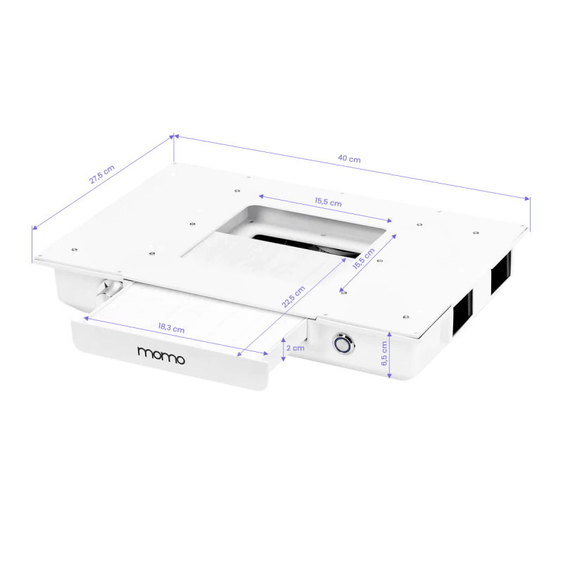 Bordet är utrustat med ett kraftfullt, inbyggt dammutsug med fyra turbiner och ett effektivt kassettfilter. Trots sin höga uppsugningskapacitet arbetar systemet tyst, vilket gör det idealiskt för både professionella nagelbyggare och hemmabruk. Ett perfekt hjälpmedel för att hålla arbetsytan fri från damm vid filning.