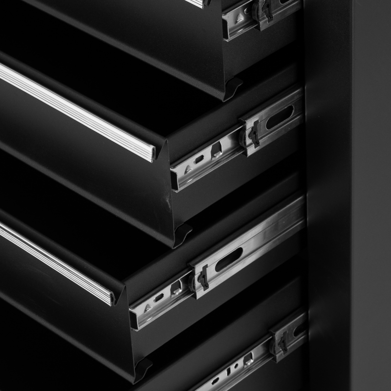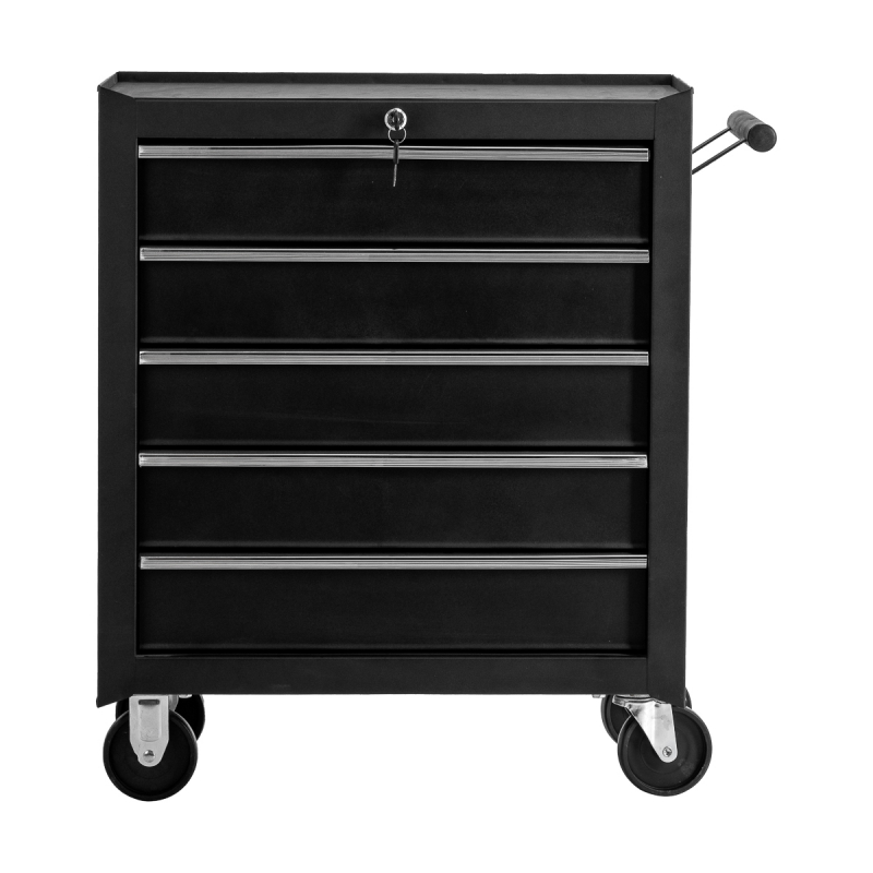 Professionell rullvagn i svart med en solid stålkonstruktion, fem utdragbara lådor, låset som förhindrar oavsiktlig öppning samt handtag/krok på sidan. Arbetsvagnen är lätt att flytta och ha nära till hands tack vare två bromsade hjul. Utmärkt alternativ till mindre tatueringsstudior, skönhetssalonger eller andra arbetsplatser där det krävs ordning och reda på produkter, verktyg och utrustning.