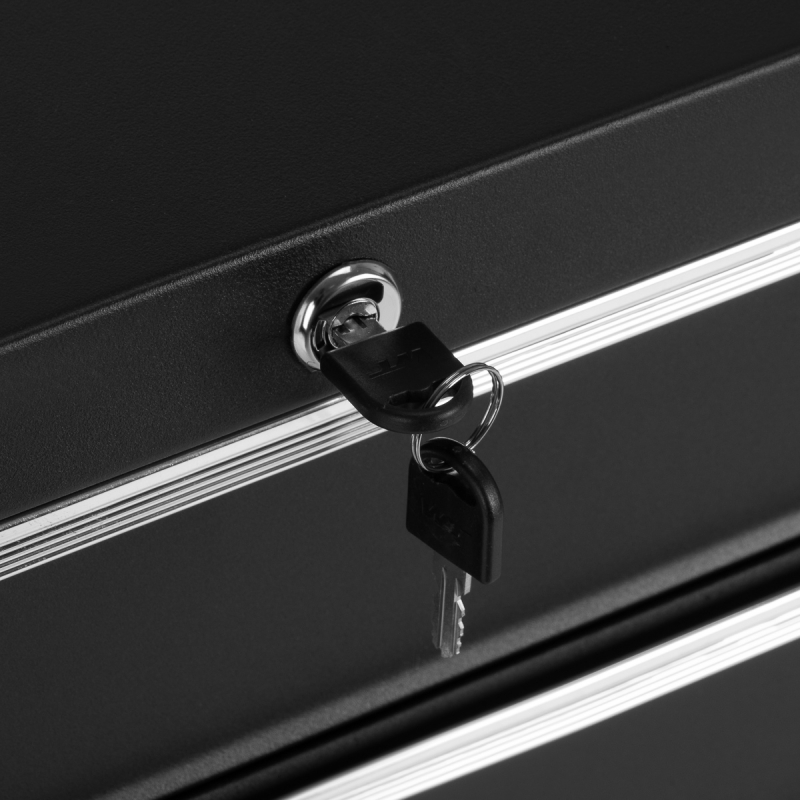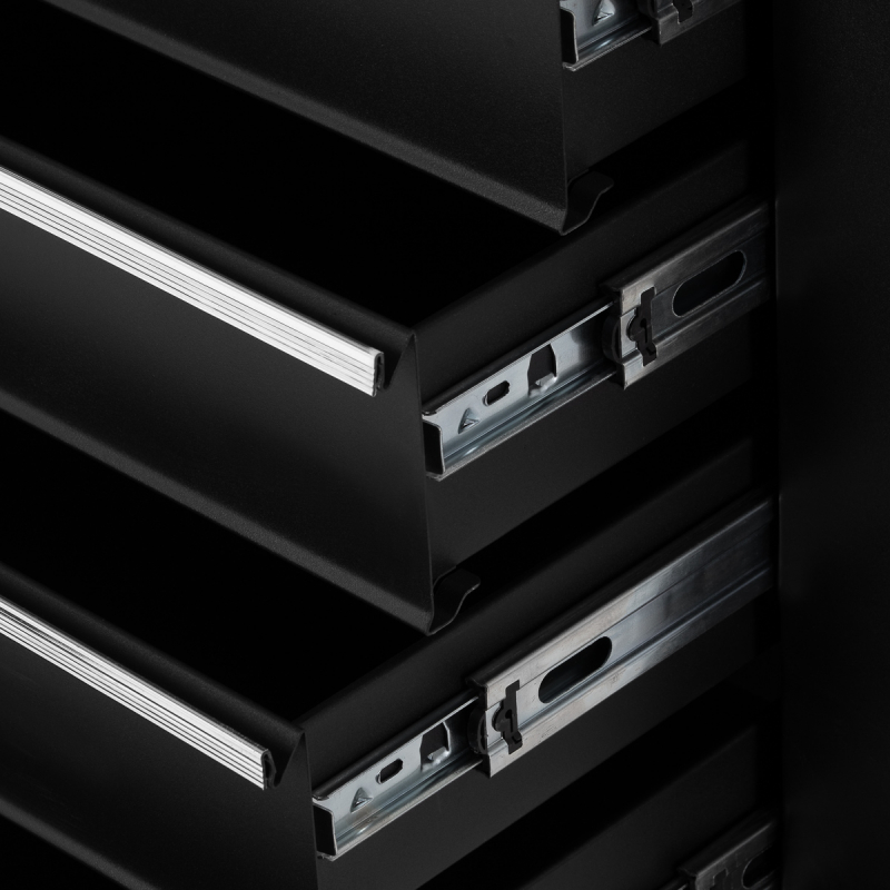 Professionell rullvagn i svart med en solid stålkonstruktion, fem utdragbara lådor, låset som förhindrar oavsiktlig öppning samt handtag/krok på sidan. Arbetsvagnen är lätt att flytta och ha nära till hands tack vare två bromsade hjul. Utmärkt alternativ till stora tatueringsstudior, skönhetssalonger eller andra arbetsplatser där det krävs ordning och reda på produkter, verktyg och utrustning.