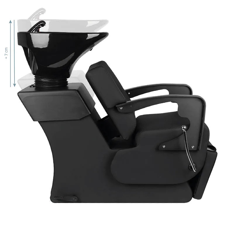 Denna moderna schamponering är en kombination av bra funktionalitet och elegant design. Det mjuka och extremt bekväma sätet är tillverkat i svart antibakteriellt konstläder av hög kvalitet som är lätt att rengöra. Schamponeringsstolen har svart bas med svart porslinsfat samt utfällbar fotstöd.