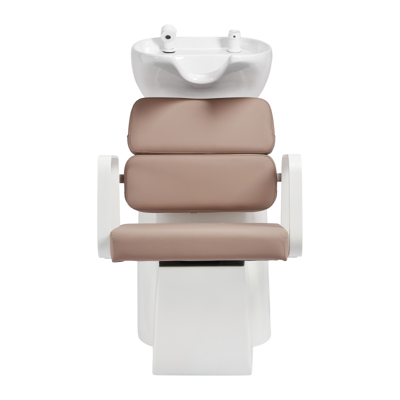Modern schamponering PORTO är en kombination av funktionalitet och elegant design. Stolen är tillverkad i beige antibakteriellt konstläder av hög kvalitet som är lätt att rengöra. Schamponeringsstolen har vit bas med vitt porslinsfat samt vita armstöd i metall.