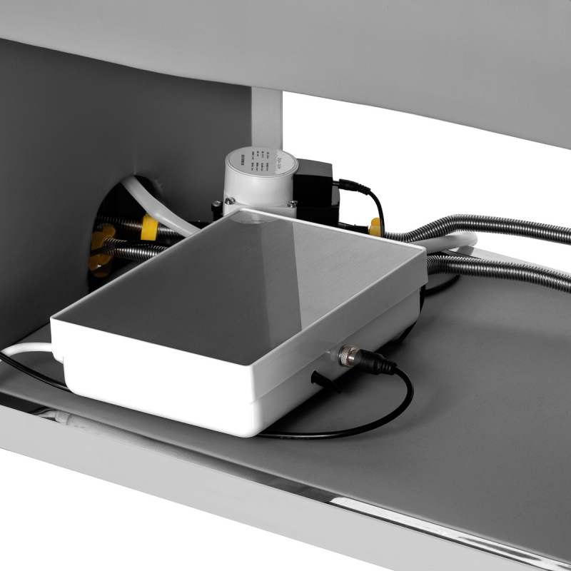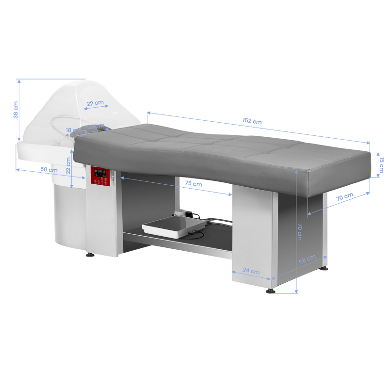 HEAD SPA 017 är en unik kombination av schamponering och massagebänk som är särskilt utformad för avancerade behandlingar där vattenmassage och ångterapi samverkar för att skapa en holistisk upplevelse av avslappning och återhämtning. Den djupa, vita keramiska skålen och gummerat nackstöd med justerbar vinkel ger en optimal hårtvättsupplevelse. Massagebänken är ergonomiskt utformad med slitstarkt skum och konstläder för korrekt kroppsstöd under behandlingar. En kudde med hål för ansiktet gör den idealisk även för massage och ansiktsbehandlingar. Förvaringsutrymmet för handdukar och tillbehör hjälper till att hålla arbetsplatsen organiserad.